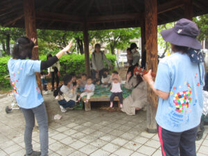 ウクレレに合わせて「チューリップ」「ちょうちょ」「アイアイ」を歌いました。